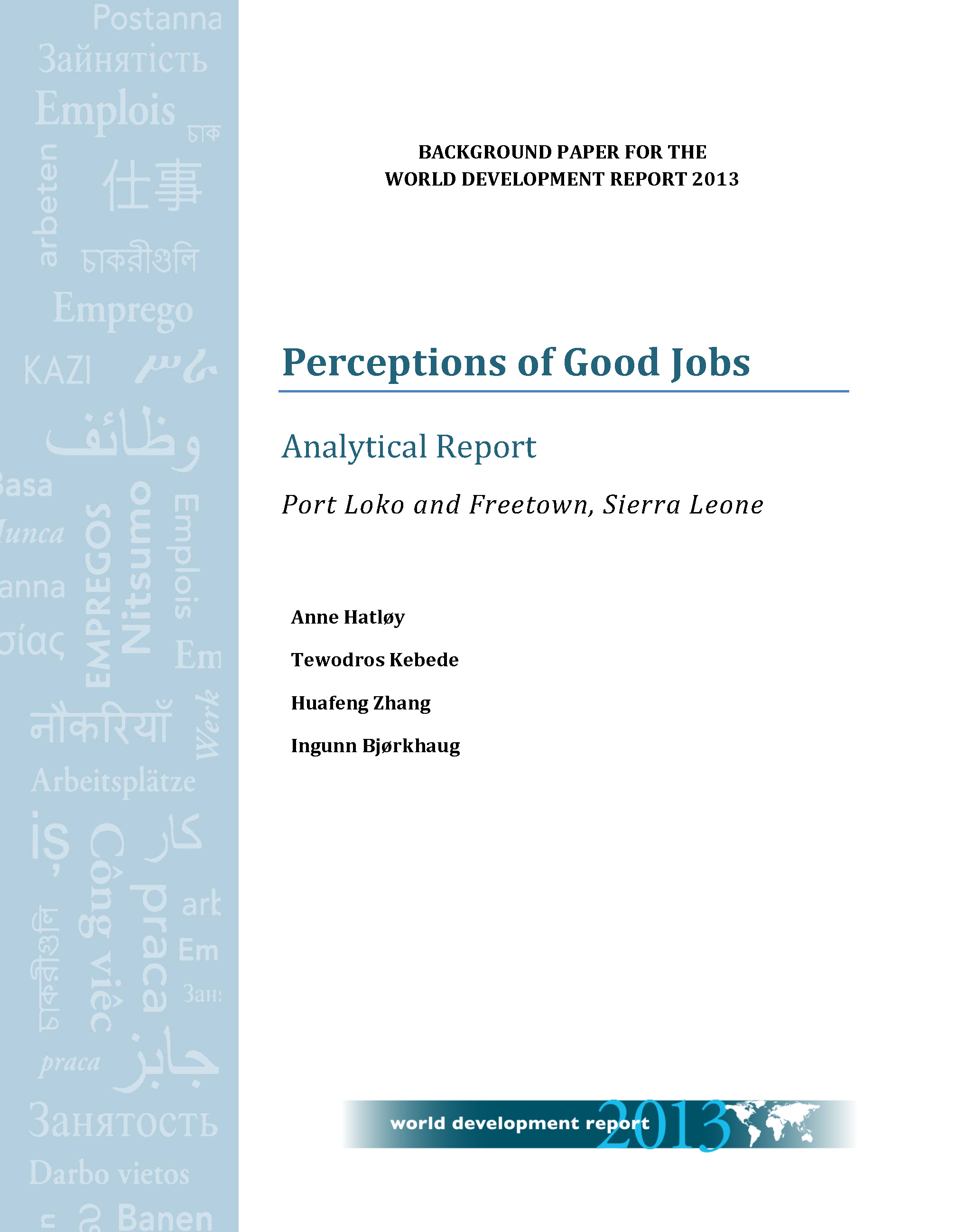 The Perceptions of Good Jobs study has been conducted in order to better understand and explain how jobs are perceived in a number of selected countries. The report is primarily targeted to provide inputs towards the WDR 2013 and is part of a series of studies conducted on perceptions of good jobs in four countries: Colombia, China, Egypt and Sierra Leone. The main emphasis has been to explore the nature of jobs that affect living standards and enhance social cohesion. The report addresses the following research questions:
