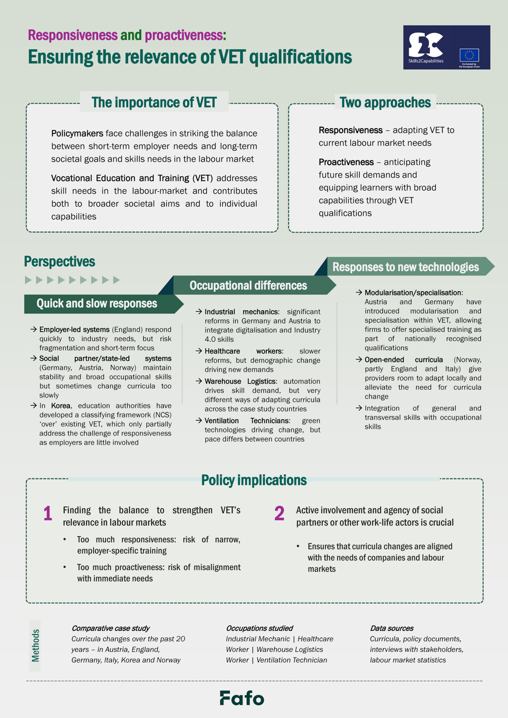 Fafo har bidratt på mange av prosjektets arbeidspakker, men har hatt særlig ansvar for komparative analyser av hvordan yrkesutdanningene helsefagarbeider, industrimekaniker, ventilasjonstekniker og lagerlogistikk har utviklet seg i seks ulike land.
