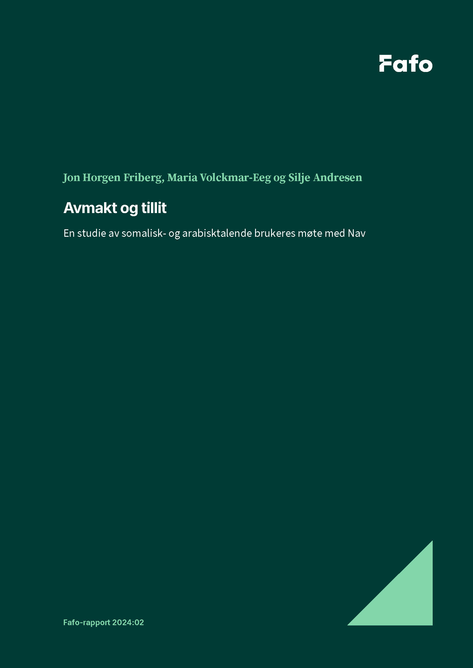 Studiens målgruppe var avgrenset til innvandrede somalisk- og arabisktalende brukere med personlig oppmøte ved Nav-kontorene. Resultatene viser at denne gruppen har systematisk dårligere opplevelser i møte med Nav enn Navs øvrige brukere. Dette kommer dels til uttrykk i spørsmål om kommunikasjon med Nav, og om hvor lett det er å forstå informasjonen de blir gitt. Det kommer også til uttrykk i spørsmål om den personlige relasjonen med veilederne. Den største misnøyen handler imidlertid om muligheter til å få møte veileder fysisk og forklare sin sak, om manglende innflytelse på sin egen oppfølging, og opplevelsen av å være underlagt Navs kontrollregime. Videre opplever de i langt mindre grad enn øvrige brukere at tiltakene og aktivitetene de deltar i er nyttige. Brukere med svake norskferdigheter, en brukerprofil kjennetegnet av behovsprøvde ytelser og aktivitetsplikt, og som i utgangspunktet har lav tillit til fremmede generelt, er de som i størst grad rapporterer om negative brukererfaringer. Funnene peker på at det som er definerende for store deler av denne gruppens erfaringer i møte med Nav, handler om selve maktforholdet i relasjonen mellom Nav og brukerne, og opplevelse av avmakt i møte med systemet.