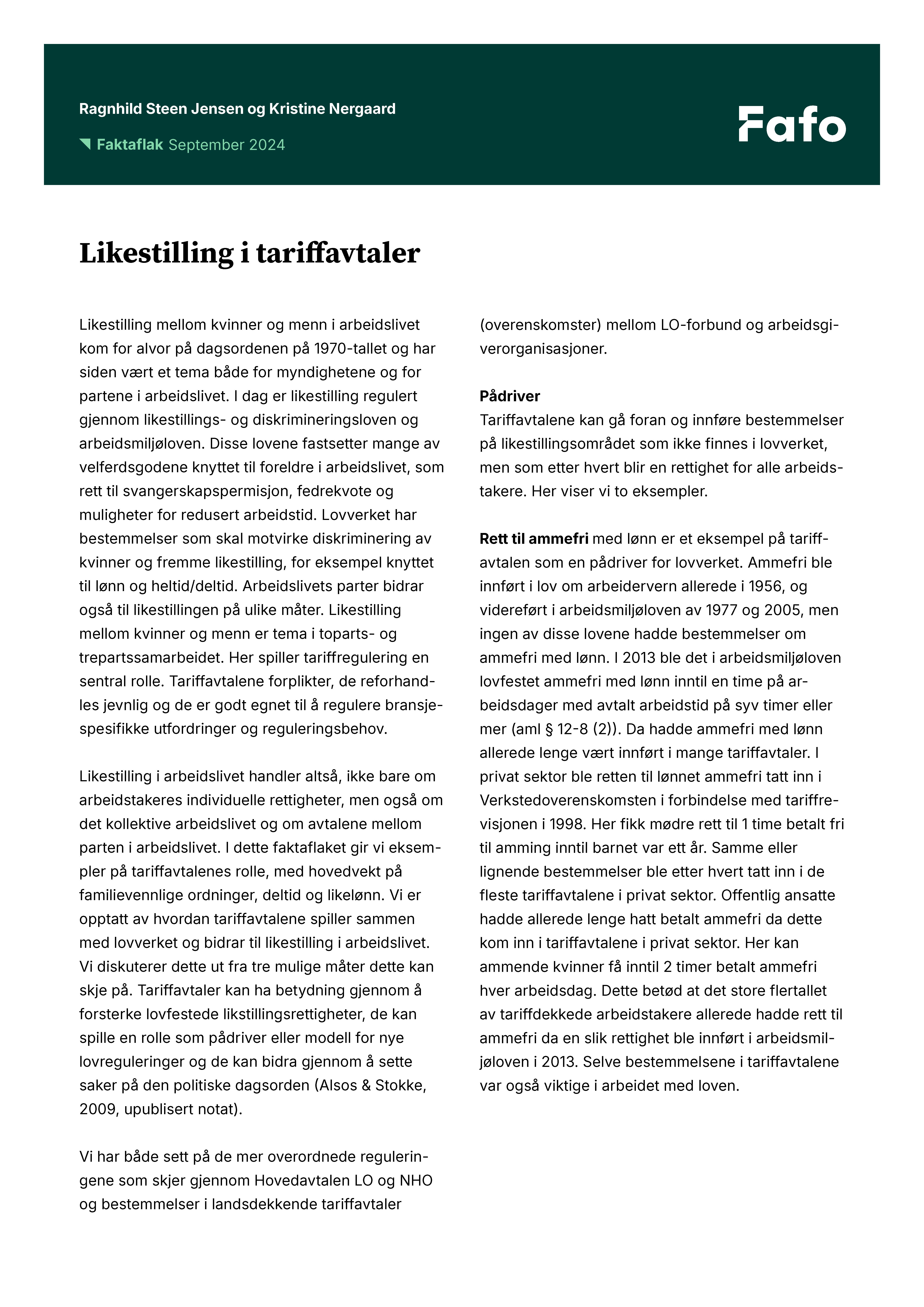 Fafo-notat 2024:13 Likestilling i tariffavtaler. Notatet og faktaflaket er finansiert av LO.